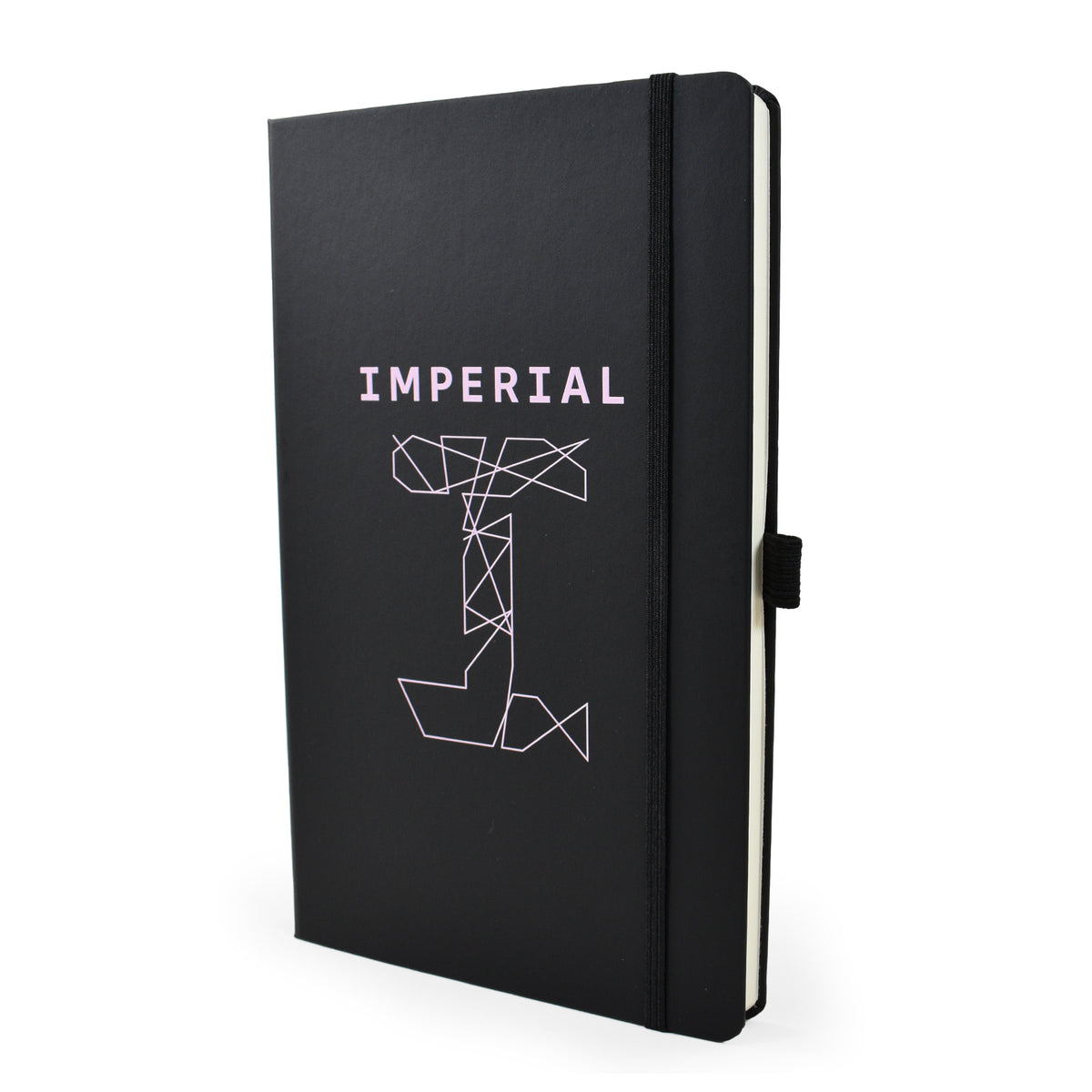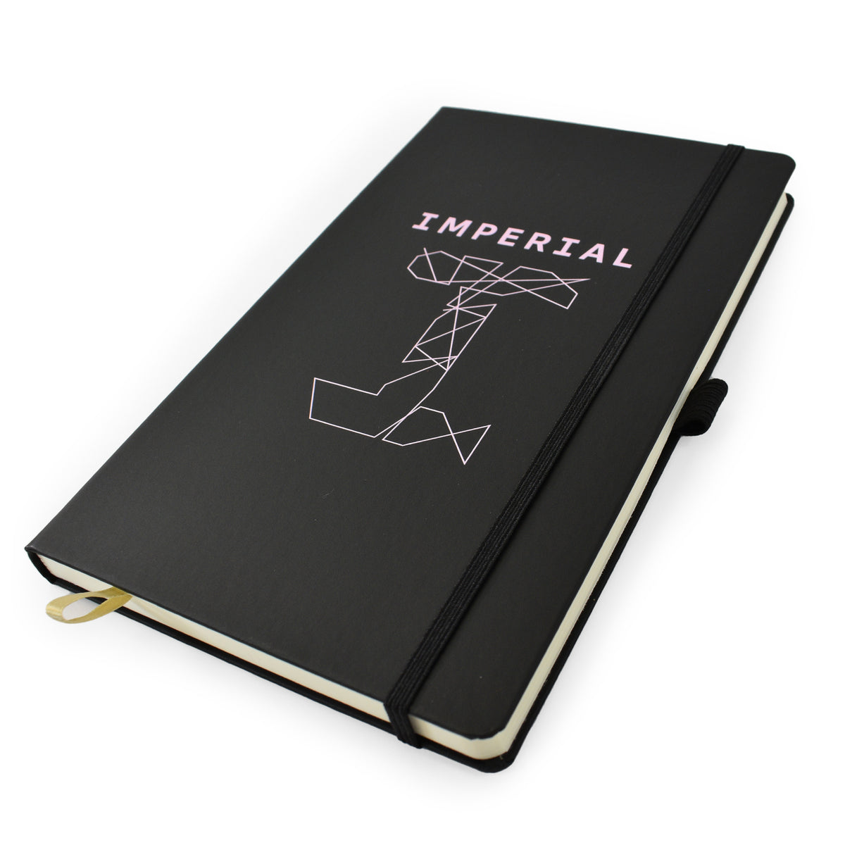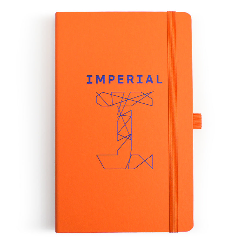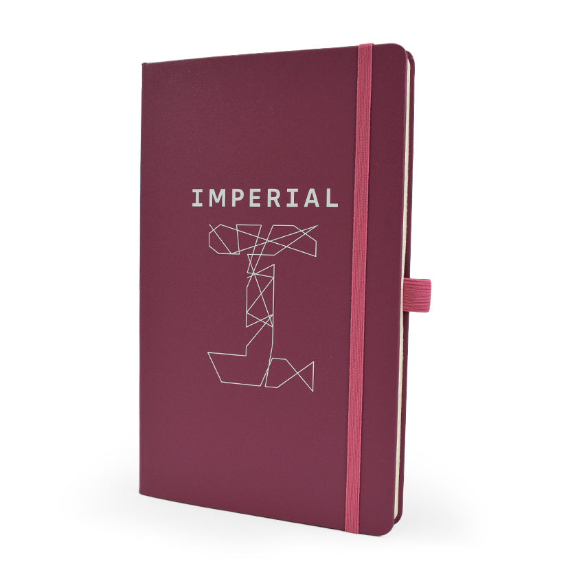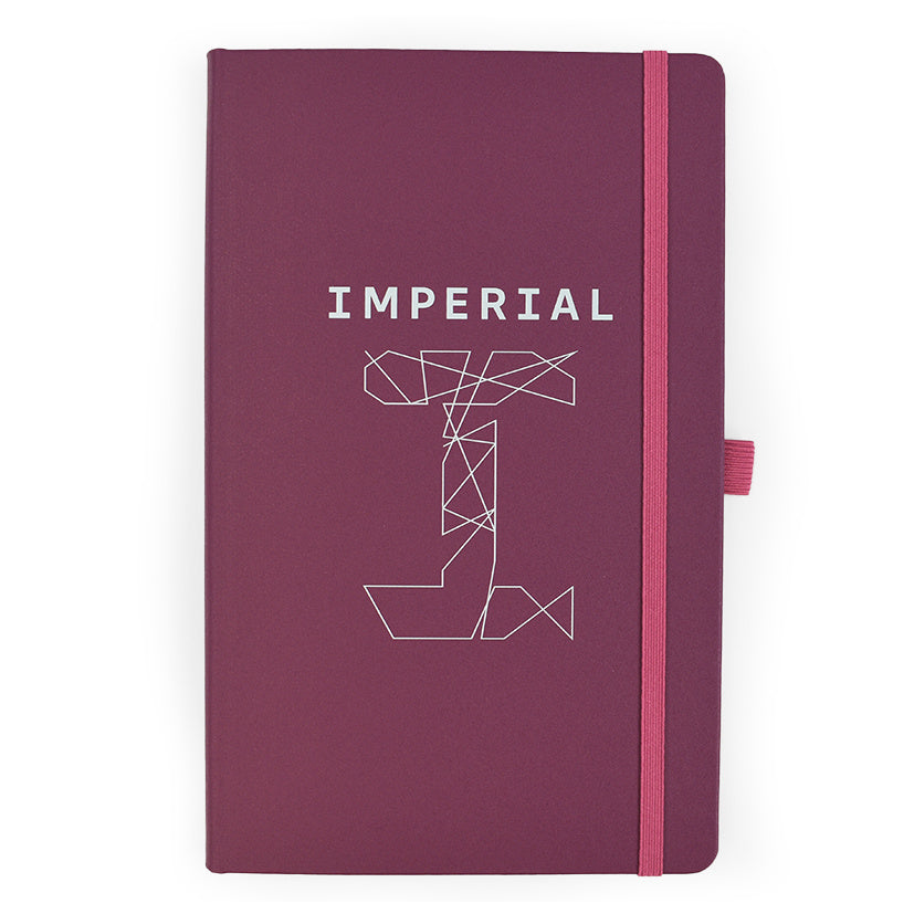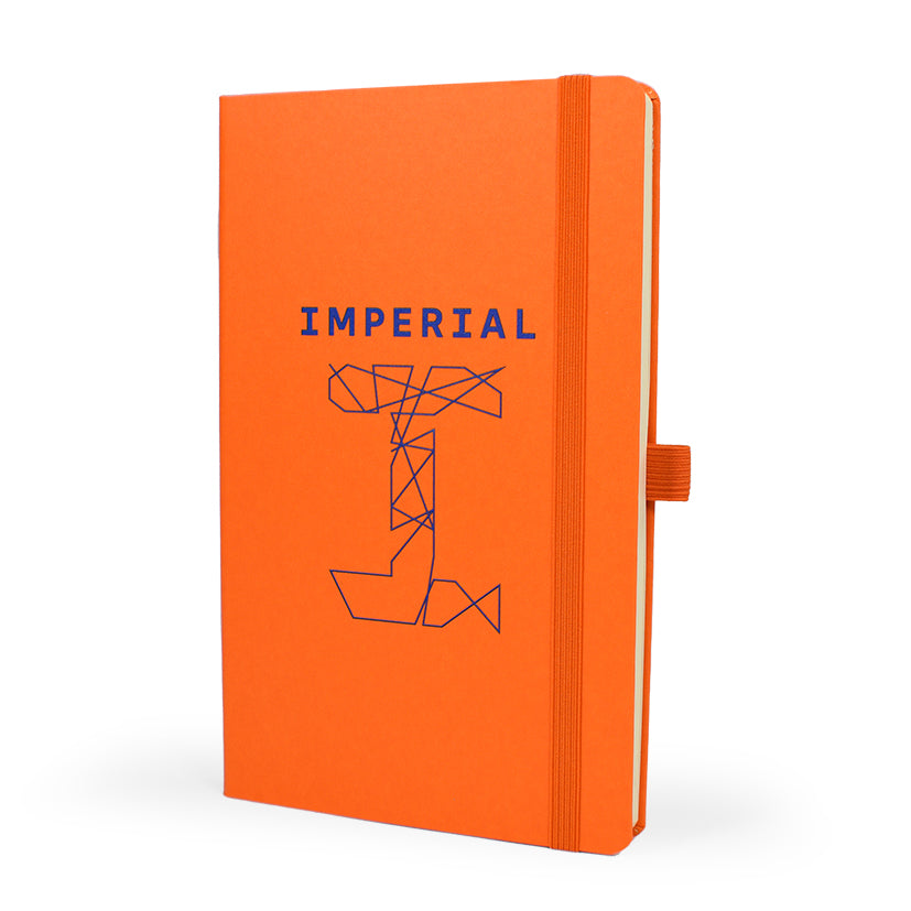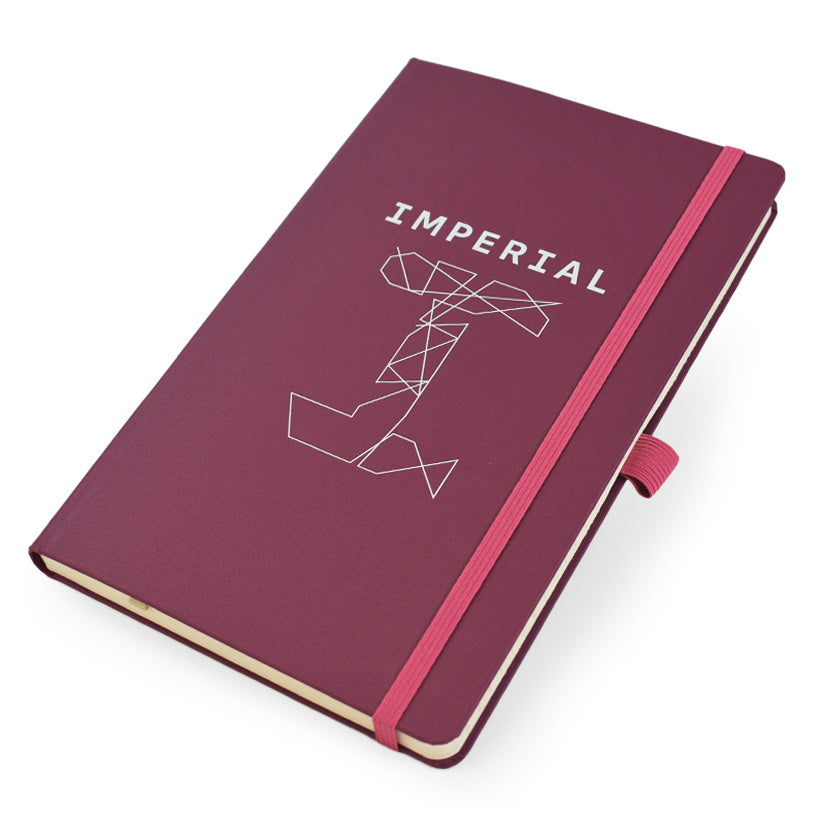 A5 lined notebook featuring FSC® certified ivory paper, rounded corners, vertical elastic band, pen loop, ribbon marker, and internal document pocket.